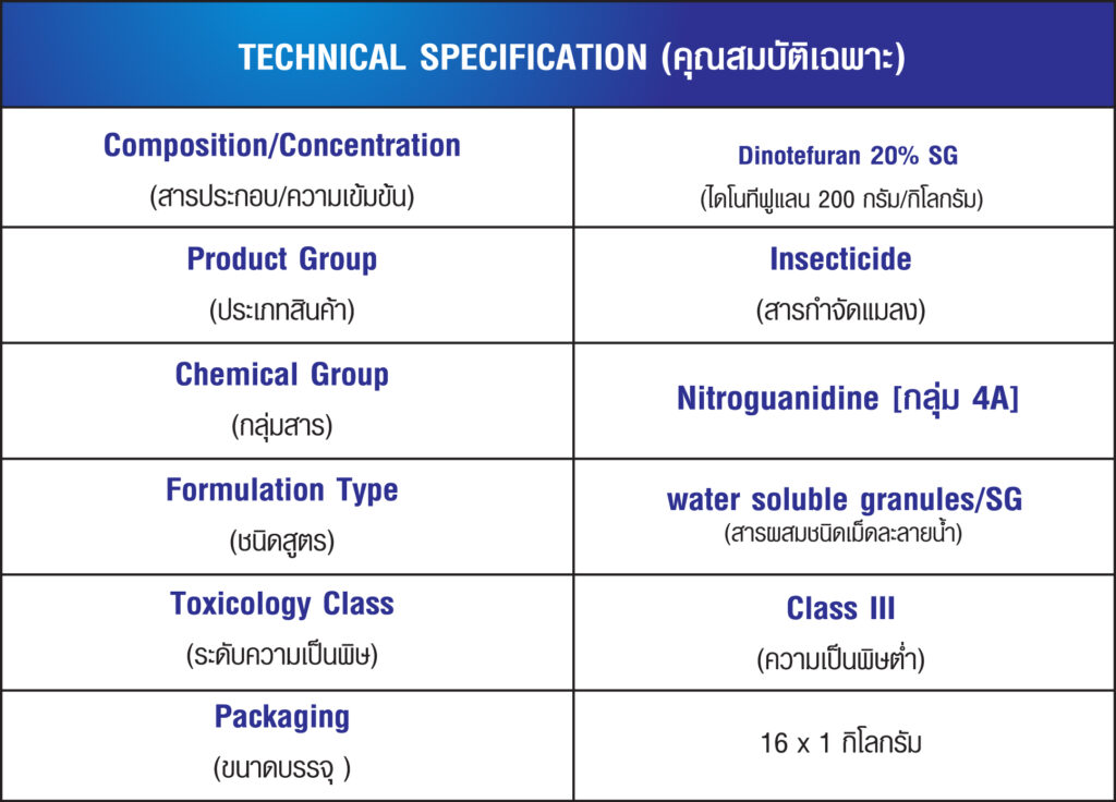 - สารกำจัดแมลงฤทธิ์ดูดซึมยุคใหม่ รุ่นที่ 3 ของสารกลุ่ม Neonicotinoid ออกฤทธิ์รวดเร็ว ทำลายระบบประสาท ยับยังการกินอาหารและแมลงตายในทีสุด