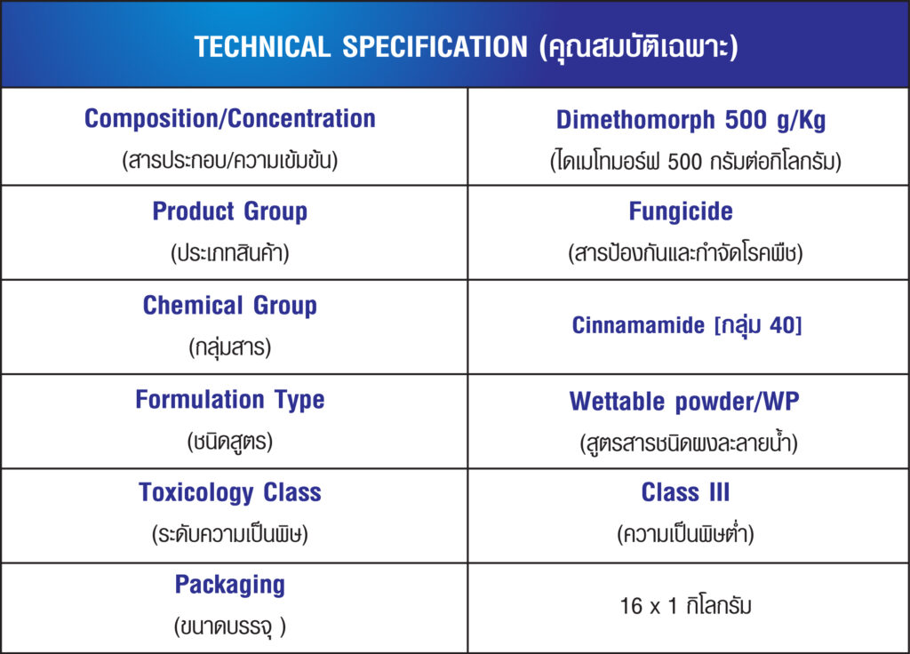 :ให้ประสิทธิภาพสูงในการป้องกันและการกำจัดได้ทุกระยะของเชื้อ Oomycetes โดยเฉพาะโรคที่เชื้อไฟทอปธอร่า เข้าใบและผลทุเรียน ที่เกิดจากเชื้อ  Phytophthora pamivola